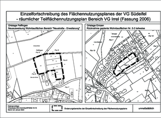 Die Ortsgemeinde Peffingen beabsichtigt die Aufstellung eines Bebauungsplanes für das Teilgebiet „Neustraße - Erweiterung“. Im laufenden Bauleitverfahren wurden die bisherigen erforderlichen bauplanungsrechtlichen Verfahrensschritte durch die Ortsgemeinde vollzogen. Mit der beabsichtigten Planung sollen die bauplanungsrechtlichen Voraussetzungen für die Entwicklung eines Allgemeinen Wohngebietes (§ 4 Baunutzungsverordnung (BauNVO) geschaffen werden. Der Flächennutzungsplan ist in einem Parallelverfahren durch die Verbandsgemeinde Südeifel anzupassen. Die frühzeitige Unterrichtung der Öffentlichkeit gemäß § 3 Abs. 1 BauGB erfolgte durch öffentliche Auslegung der Planentwurfsunterlagen bei der Verwaltung in der Zeit vom 08.08.2022 bis einschließlich zum 07.09.2022. Die Öffentlichkeit wurde frühzeitig über die allgemeinen Ziele und Zwecke der Planung, sich wesentlich unterscheidende Lösungen, die für die Neugestaltung oder Entwicklung des Gebietes in Betracht kommen, und die voraussichtlichen Auswirkungen der Planung öffentlich unterrichtet. Die Behörden und sonstigen Träger öffentlicher Belange sowie die berührten benachbarten Gemeinden wurden gemäß § 4 Abs. 1 / § 2 Abs. 2 BauGB am Verfahren beteiligt. Mit Einleitung des FNP-Änderungsverfahrens (Verfahrensschritte § 3 Abs. 1 und § 4 Abs. 1 BauGB), wurde erst nur die Änderung des FNP in der Ortslage Peffingen behandelt. Im Zuge der Einleitung des Verfahrens wurde zudem eine landesplanerische Stellungnahme beantragt. Aufgrund des Ergebnisses der landesplanerischen Stellungnahme wurde das FNP-Verfahren nunmehr um die Ortslage Ernzen erweitert, in der eine sog. „Tauschfläche“ i.S.d. Ziel Nr. 55 ROPneu/E (Entwurf Regionaler Raumordnungsplan Januar 2014) als Wohnbaufläche aus dem FNP zugunsten von Peffingen zurückgenommen werden soll. Der Geltungsbereich der Planänderung umfasst folgende Flurgrundstücke der Gemarkung Peffingen, Flur 6, die Flurstücke 19/3, 19/4, 19/5, 20/2 tlw. und 28/2 tlw. Der Geltungsbereich der Planänderung umfasst folgende Flurgrundstücke der Gemarkung Ernzen, Flur 7, Flurstücke 4, 5 tlw., 95 sowie 106 tlw. Die genaue Abgrenzung der Geltungsbereiche ergibt sich aus dem dieser Bekanntmachung beigefügten Lageplan.