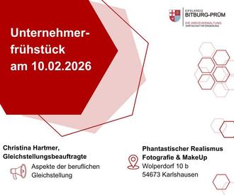Das nächste Unternehmerfrühstück findet am Dienstag, den 10.02.2026 ab 08:30 Uhr im Fotostudio von Sabine Tossing-Thiex (Phantastischer Realismus) in Karlshausen statt. Christina Hartmer als Gleichstellungsbeauftragte der Kreisverwaltung spricht über die vielfältigen Aspekte der beruflichen Gleichstellung. Neben den gesetzlichen Pflichten aus dem Allgemeines Gleichbehandlungsgesetz werden auch die Möglichkeiten der Vereinbarkeit von Beruf und Familie und den daraus resultierenden Chancen zur Erhöhung des Arbeitskräftepotentials erläutert.
