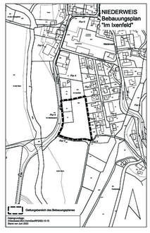 Der Gemeinderat der Ortsgemeinde Niederweis hat in der der öffentlichen Sitzung vom 05.06.2022 die Neuaufstellung hinsichtlich des Bebauungsplanes für das Teilgebiet „Im Ixenfeld“ (früher „Am Daufenbach“) gemäß § 2 Abs. 1 BauGB beschlossen. Mit der Ausweisung eines neuen Wohnbaugebietes plant die Gemeinde eine nachfragegerechte Vorhaltung von Wohnbaugrundstücken in der Gemeinde. Zu der beabsichtigten Planung gemäß § 13b BauGB sollen Außenbereichsflächen - durch die die Zulässigkeit von Wohnnutzungen auf Flächen begründet wird mit einer Grundfläche von weniger als 10.000 Quadratmetern im Sinne des § 13a Abs. 1 Satz 2 BauGB und sich an im Zusammenhang bebaute Ortsteile anschließen - einbezogen werden. Der Geltungsbereich zum Bebauungsplan umfasst folgende Flurgrundstücke: Gemarkung Niederweis, Flur 4, Flurstücke 43, 44 und 45/2. Die genaue Abgrenzung des Plangebietes ergibt sich aus dem beigefügten unmaßstäblichen Lageplan. Eine förmliche Umweltprüfung (Umweltbericht) gemäß § 2 Abs. 4 BauGB kann entfallen. Der Aufstellungsbeschluss vom 21.11.2019, in dem das Plangebiet noch mit „Am Daufenbach“ benannt war, wurde mit Beschluss vom 05.06.2022 aufgehoben.