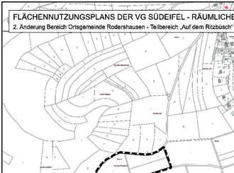 Gemarkung Rodershausen, Flur 1, Flurstücke: 1, 2, 3, 48 teilweise und 49 teilweise. Die genaue Abgrenzung des Geltungsbereiches ergibt sich aus dem dieser Bekanntmachung beigefügten Lageplan. Im Rahmen des laufenden bauplanungsrechtlichen Verfahrens beschloss der Verbandsgemeinderat Südeifel in seiner Sitzung vom 05.10.2023 die Auslegung des Planentwurfs gemäß § 3 Abs. 2 BauGB, sowie die Beteiligung der Behörden/Träger öffentlicher Belange/berührte benachbarte Gemeinden gemäß den §§ 4 Abs. 2 / § 2 Abs. 2 BauGB.