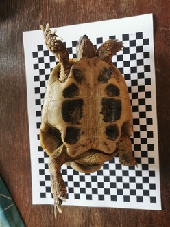 Vormittags am 05.09.2023 wurde auf einem Grundstück in Karlshausen eine griechische Landschildkröte, männlich, knapp 720 Gramm schwer, gefunden. Das Alter der Schildkröte wird auf 10-15 Jahre geschätzt. Die Panzerschilde sind minimal ineinander verwachsen.