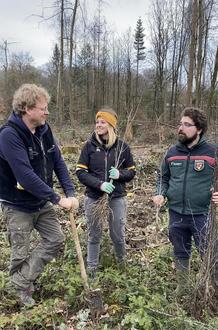 Unter der Leitung von Förster Julian Gröber haben viele Freiwillige bei der Baumpflanzaktion in Ernzen geholfen. (v. l. n. r.: Bruno Zwank und Anna Carina Krebs (Geschäftsführer und Tourismusmanagerin der Felsenland Südeifel Tourismus GmbH), Julian Gröber (Revierförster).