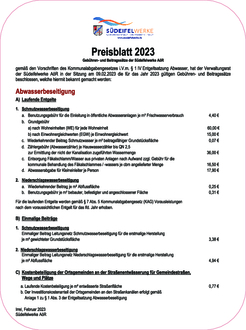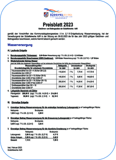 Der Verwaltungsrat der Südeifelwerke AöR hat in seiner Sitzung am 09.02.2023 die nachfolgenden Gebühren- und Beitragssätze für die Betriebszweige Wasserversorgung und Abwasserbeseitigung für das Jahr 2023 beschlossen, die hiermit gemäß § 1 Abs. 3 der Entgeltsatzung Wasserversorgung und § 1 Abs. 4 der Entgeltsatzung Abwasserbeseitigung, öffentlich bekannt gemacht werden.
