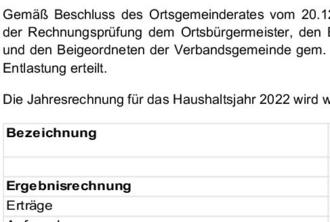 Gemäß Beschluss des Ortsgemeinderates vom 20.12.2023 wurde aufgrund des Ergebnisses der Rechnungsprüfung dem Ortsbürgermeister, den Beigeordneten sowie dem Bürgermeister und den Beigeordneten der Verbandsgemeinde gem. § 114 GemO für das Haushaltsjahr 2022 Entlastung erteilt.