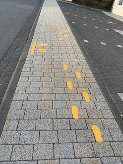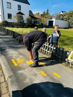 Dem Vorschlag der Vorsitzenden des Elternbeirates der KiTa, Sophia Schneider, "Gelbe Füße" an bestimmtem Stellen zu markieren, damit die KiTa- und Schulkinder die Straßen an gut übersichtlichen Stellen queren, stimmte der Gemeinderat Ende letzten Jahres zu. André Schneider, aktiv für die KiTa bei verschiedenen Projekten, setzte die Idee mit Unterstützung seiner drei Sprösslinge um.