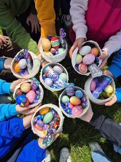 Von Karfreitag bis Karsamstag waren auch dieses Jahr die Kläpperkinder unterwegs und ersetzten die Glocken der Kirche. Am Karsamstag wurde dann, nach einem Snack, Ostereier in verschiedenen Techniken gefärbt und Osternester gebastelt