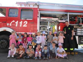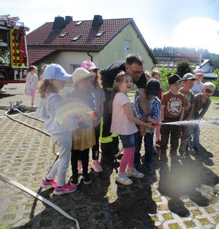 Ebenso die Feuerwehr in Uersfeld ließ nicht lange auf sich warten. Bei sonnigem Wetter haben sich die Maxi -Kinder auf den Weg zur Feuerwehrwache in Uersfeld gemacht. Im Hof konnte bereits das große Feuerwehrauto bestaunt werden. Zunächst hat Andreas Schürmann von der Feuerwehr Uersfeld den Kindern wichtige Informationen über die Aufgaben der Feuerwehr erzählt und mit praktischen Beispielen ergänzt. Zum Thema Brandschutz lernten die Kinder wie man einen Notruf absetzt, welche fünf W-Fragen es zu beantworten gilt und wie man bei einem Brand richtig das Haus verlässt. Weiterhin kennen die Kinder nun auch Möglichkeiten auf einen Brand aufmerksam zu werden, durch beispielsweise Rauchmelder und wissen wo sie in der Kita den Notausgang anhand der grünen Notausgangsschilder finden. Auch eine Erzieherin verwandelte sich in eine Feuerwehrfrau und durfte die komplette Feuerwehrkleidung mal Probe tragen. Im Feuerwehrauto gab es eine Menge an Werkzeug zu erkunden, welches teilweise sehr schwer war. Highlight des Besuchs war das Wasserspritzen mit den Schläuchen am Ende des Ausflugs. Hierzu hatte Herr Schürmann verschieden große Schläuche bereitgelegt, welche natürlich alle von den Kindern getestet werden durften.