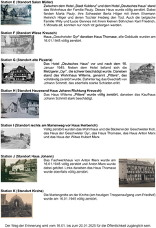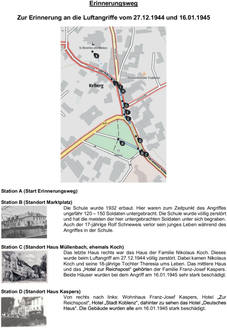 Im Rahmen des Gedenktages an die Bombardierung Kelbergs vor 80 Jahren wird ein Erinnerungsweg mit historischen Fotos vom Marktplatz bis zur Kirche eingerichtet. Dieser wird vom 16.01. bis 20.01.25 für die Öffentlichkeit zugänglich sein.