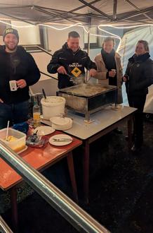Am Freitag, den 28.11.2025, um 18:00 Uhr, wurde in unserem Dorf erneut das Reibekuchenfest (Kröbbelche) gefeiert. Schon kurz vor Beginn füllte sich der Platz vor dem Gemeindehaus mit den ersten Besuchern, und der würzige Duft frisch gebratener Reibekuchen lag einladend in der Luft.