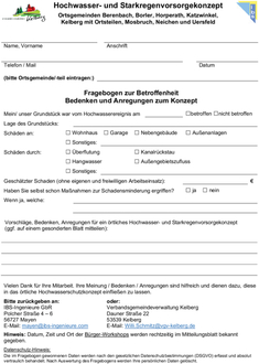 Die Bewohner der oben aufgeführten 8 Ortsgemeinden haben die Möglichkeit in diesem Fragebogen ihre Betroffenheiten an den Hochwasserereignissen der letzten Jahre mitzuteilen, sowie Anregungen, Bedenken und Vorschläge zum Hochwasser- und Starkregenvorsorgekonzept zu äußern. Bitte machen Sie davon regen Gebrauch.