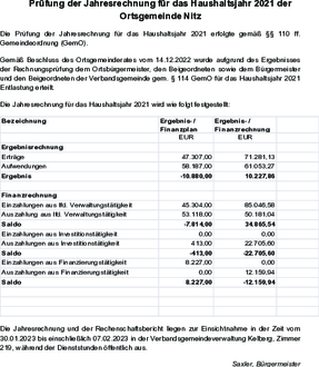 Gemäß Beschluss des Ortsgemeinderates vom 14.12.2022 wurde aufgrund des Ergebnisses der Rechnungsprüfung dem Ortsbürgermeister, den Beigeordneten sowie dem Bürgermeister und den Beigeordneten der Verbandsgemeinde gem. § 114 GemO für das Haushaltsjahr 2021 Entlastung erteilt.