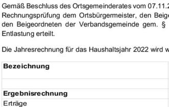 Gemäß Beschluss des Ortsgemeinderates vom 07.11.2023 wurde aufgrund des Ergebnisses der Rechnungsprüfung dem Ortsbürgermeister, den Beigeordneten sowie dem Bürgermeister und den Beigeordneten der Verbandsgemeinde gem. § 114 GemO für das Haushaltsjahr 2022 Entlastung erteilt.