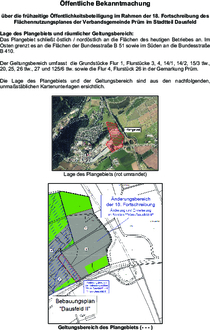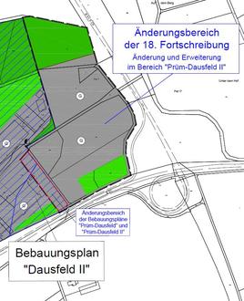Die 18. Fortschreibung des Flächennutzungsplanes der Verbandsgemeinde Prüm erfolgt gem. § 8 Abs. 3 BauGB im Parallelverfahren, also gleichzeitig mit der Änderung und Erweiterung des Bebauungsplanes „Prüm-Dausfeld-II“ der Stadt Prüm.