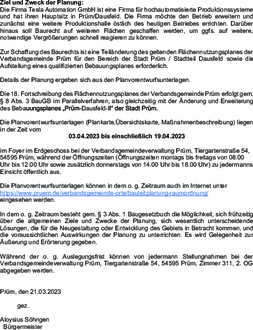Die Firma Tesla Automation GmbH ist eine Firma für hochautomatisierte Produktionssysteme und hat ihren Hauptsitz in Prüm/Dausfeld. Die Firma möchte den Betrieb erweitern und zunächst eine weitere Produktionshalle östlich des heutigen Betriebes errichten. Darüber hinaus soll Baurecht auf weiteren Flächen geschaffen werden, um ggfs. auf weitere, notwendige Vergrößerungen schnell reagieren zu können.