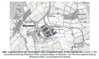 Die vorliegende Planänderung zum Flächennutzungsplan der Verbandsgemeinde Prüm betrifft zwei einzelne Änderungspunkte in der Ortsgemeinde Weinsheim. Der Änderungsbereich umfasst insgesamt eine Fläche von rund 8,5 ha und überdeckt teilweise den Geltungsbereich des rechtskräftigen Bebauungsplans „Industriegebiet“ sowie den planungsrechtlichen Außenbereich gemäß § 35 BauBG. Teil der 8,5 ha Änderungsfläche sind 5,9 ha gewerbliche Baufläche und die Neuausweisung von ca. 2,6 ha Ausgleichsfläche.