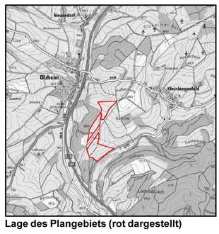 Das Plangebiet liegt ca. 350 m südöstlich von Olzheim und ca. 600 m südwestlich von Kleinlangenfeld. Die Fläche ist ca. 16,4 ha groß und wird landwirtschaftlich genutzt.