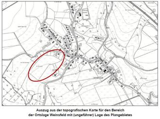 Der Geltungsbereich umfasst folgende Flurstücke der Gemarkung Weinsfeld: Flur 51, Flurstück 84, 85/1, 85/2, 85/3 und 86. Das Plangebiet hat eine Gesamtgröße von ca. 2,8 ha.