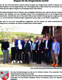 Am 05. Mai 2023 überreichte Landrat Andreas Kruppert der Ortsgemeinde Lierfeld im Beisein der Ratsmitglieder und des Beigeordneten der Verbandsgemeinde Arzfeld, Alfred Pick, die Erlaubnis zur Führung eines eigenen Wappens an Ortsbürgermeister Heinz Müsch.