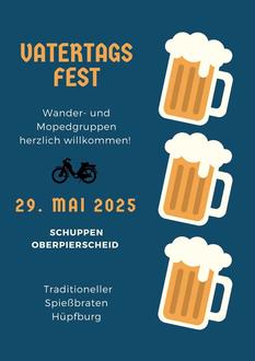 Die Mitglieder des Fördervereines Kapelle, Jugend und Senioren Oberpierscheid e. V. sowie alle Bewohner des Ortsteiles Oberpierscheid freuen sich darauf am diesjährigen "Vatertag" Gastgeber für Jung und Alt, für Einheimische, Ehemalige und Gäste, für Wander- und Mopedgruppen und für alle Besucher zu sein. Das Fest wird in und um den Gemeindeschuppen stattfinden. Für das leibliche Wohl ist durch erfrischende Getränke, Spießbraten und weitere Grillwaren bestens gesorgt. Beginnend mit dem Frühschoppen wird ganztätig zur Einkehr und zum Verweilen eingeladen. Für Kinder steht eine Hüpfburg bereit.