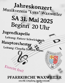 Der Musikverein "Lyra" Waxweiler 1898 e.V. lädt herzlich ein zum Jahreskonzert am 31. Mai.Programm: • Jugendkapelle MV Waxweiler unter der Leitung von Rainer Schwickerath • Hauptorchester MV Waxweiler unter der Leitung von Claudia Steffes-MausIm Anschluss findet im Devonium ein Empfang statt.Der Eintritt ist frei.