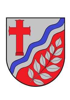 „Silber über Rot durch blau-silbernen Wellenbalken schräglinks geteilt, vorn ein rotes Sockelkreuz, Arme und Mittelschaft in angedeuteter Lilienform endend, hinten ein silbernes Eschenblatt.“