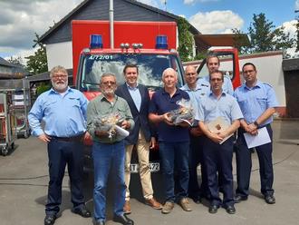 (v. l. Wehrleiter Walter Thibol, Horst Heiles, Bürgermeister Johannes Kuhl, Werner Gansen, Wehrführer Daniel Schwinden, Andreas Schreiber, Uwe Hau u. Lars Allar)