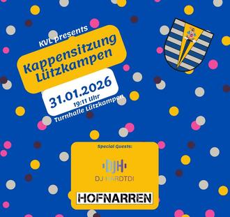 Kappensitzung Lützkampen SAMSTAG, 31.01.2026, 19:11 UHR | TURNHALLE | LÜTZKAMPEN Feiern Sie an diesem Abend mit dem Karnevalsverein Lützkampen die große Kappensitzung und verbringen Sie närrische Stunden mit verschiedenen Büttenreden und Gardetänzen. Special Guests: Hofnarren und DJ HARDTDI
