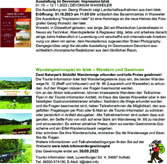 Die Tourist-Information Islek lädt Wanderbegeisterte dazu ein, die beiden Wanderwege Nr. 12 (Reiff und Irrhausen) und Nr. 86 (Lauperath und Waxweiler) zu erkunden. Auf den Wegen müssen vier Fragen beantwortet werden.