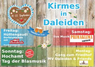 Der Musikverein Daleiden lädt vom 19. bis 22. September zur traditionellen Kirmes auf dem Marktplatz ein. Das beheizte Festzelt bietet Musik, Unterhaltung und kulinarische Genüsse.Programm-Highlights: