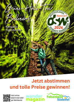 Die „Grüne-Hölle-Tour Bollendorf“ im Felsenland Südeifel gehört zu den 15 Tagestouren, die die Jury des Wandermagazins für den diesjährigen Wettbewerb "Deutschlands schönster Wanderweg 2024" nominiert hat. Es ist der einzige Weg in der Eifel, der in diesem Jahr im Rennen ist. Die knapp sieben Kilometer lange Tour an der deutsch-luxemburgischen Grenze bietet schmale Pfade und eine beeindruckende Landschaft. Der Pfad der Grünen Hölle Tour, welcher mitten durch den Bollendorfer Wald geht, führt die Besucher:innen an einer nahezu märchenhaften Welt mit bizarren Felsgebilden, Schluchten und hohen Felstürmen vorbei.