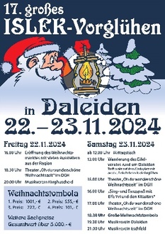 Besuchen Sie das vorweihnachtliche 'Islek Vorglühen' mit verschiedenen Anbietern und musikalischer Unterhaltung.Freitag 22.11.2024 16.00 Uhr Eröffnung des Weihnachtsmarktes mit vielen Ausstellern aus der Region18.30 Uhr Theater „Oh du wunderschöne Weihnachtszeit“ im DGH20.00 Uhr Musikverein RinghuscheidSamstag 23.11.2024ab 12.00 Uhr Mittagstisch13.00 Uhr Wanderung des Eifelvereins rund um Daleiden, Treffpunkt: auf dem Marktplatz mit anschl. Einkehr beim Islek Vorglühen15.00 Uhr Theater „Oh du wunderschöne Weihnachtszeit“ im DGH16.00 Uhr „Sing- und Tanzspaß mit Elfe Yvi und den Kitastars“17.00 Uhr Theater „Oh du wunderschöne Weihnachtszeit“ im DGH18.30 Uhr Große Weihnachtstombola19.30 Uhr Musikverein Daleiden21.00 Uhr Musikverein Eschfeld