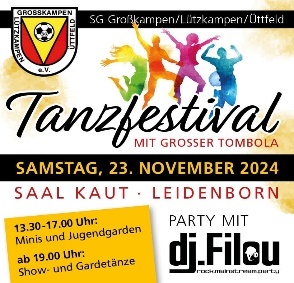 Die SG Großkampen/Lützkampen/Üttfeld veranstaltet auch in diesem Jahr wieder das Tanzfestival im Saal Kaut. Einige Tanzgruppen sind in Leidenborn zu Gast und zeigen Show- und Gardetänze.13.30 - 17.00 Uhr: Minis und Jugendgarden ab 19.00 Uhr: Show- und Gardetänze anschließend Party mit DJ.FilouDie große Tombola der SG GLÜ verspricht tolle Preise.