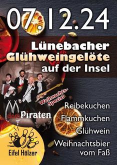 Lünebacher Glühweingelöte am 7. Dezember auf der Insel an der Prüm. Es gibt Live-Musik mit den domPiraten, Reibekuchen, Flammkuchen, Glühwein und Weihnachtsbier vom Fass.