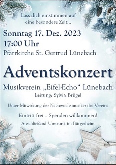 Der Musikverein "Eifel-Echo" Lünebach lädt herzlich ein, sich bei besinnlicher Musik und einem anschließenden gemütlichen Umtrunk im Bürgerheim auf Weihnachten einzustimmen.