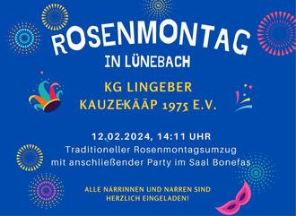 Am Rosenmontag veranstaltet die KG Lingeber Kauzekääp für alle Jecken der Region den Straßenumzug mit anschließender Party im Saal Bonefas. Hier ist der Eintritt frei. Die Karnevalsgesellschaft freut sich über zahlreiche Besucher.