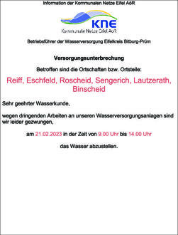 wegen dringenden Arbeiten an unseren Wasserversorgungsanlagen sind