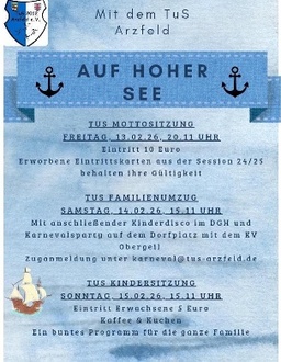 SAMSTAG, 14.02.2026, 15:11 UHR | STRASSENUMZUG, ANSCHLIESSENDEND DGH ARZFELDFamilie, Kinder, Geselligkeit und Spaß werden beim Arzfelder Familienumzug großgeschrieben!Karnevalsparty auf dem Dorfplatz mit dem KV ObergeilKinderdisco im DGH im Anschluss an den UmzugZuganmeldung unter karneval@tus-arzfeld.de