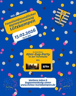 SONNTAG, 15.02.2026, 14:11 UHR | LÜTZKAMPENKarnevalssonntag in Lützkampen: Umzug ab 14:11 Uhr – anschließend After-Zug-Party mit DJ Filou & HELLO in der Turnhalle.