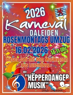 MONTAG, 16.02.2026, 14:11 UHR | STRASSENUMZUG, ANSCHLIESSEND DGH | DALEIDENAn diesem Tag führt der Umzug durch die Straßen von Daleiden mit Abschluss im DGH. Der Musikverein Hëpperdanger-Musik als "Crazy Chickens" begleitet den Zug mit echten KarnevalshitsHierzu sind alle Jecken der Region recht herzlich eingeladen.Weitere Informationen unter: www.karneval-daleiden.de