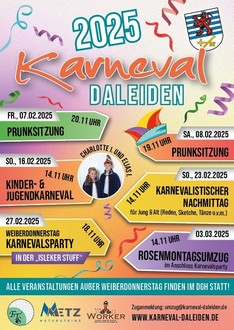 An diesem Tag führt der Umzug durch die Straßen von Daleiden mit anschließendem Abschluss im DGH Hierzu sind alle Jecken der Region recht herzlich eingeladen.Weitere Informationen unter: www.karneval-daleiden.de