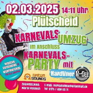 An diesem Tag führt der Umzug durch die Straßen durch Plütscheid. Hierzu sind alle Jecken der Region recht herzlich eingeladen.Im Anschluss findet eine Karnevalsparty mit DJ Hardliner N-Dee statt.