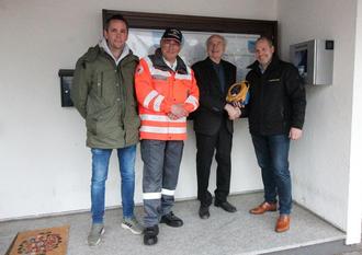 v. l. n. r.: Simon Rauen (Westnetz), Marcus Krebs (Ersthelfer), Ortsbürgermeister Peter Hartogh, danken Thomas Hau von Westenergie für die Unterstützung bei der Anschaffung des Defibrillators