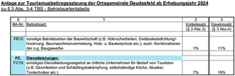 Die Anlage zur Tourismusbeitragssatzung – Betriebsartentabelle zu § 3 Abs. 3 und 4 TBS – der Ortsgemeinde Deudesfeld wird wie folgt neu gefasst: