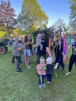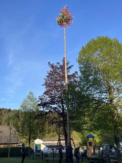 Viele kleine und große Helfer schmückten bei schönstem Wetter den Maibaum, bevor die Männer der Feuerwehr diesen aufstellten.