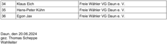 Aufgrund eines redaktionellen Fehlers in der Bekanntmachung in der letzten Ausgabe des Mitteilungsblattes (Ausgabe 26/2024) erfolgt nachstehend eine erneute Bekanntmachung des Ergebnisses der Wahl zum Verbandsgemeinderat Daun am 9. Juni 2024.