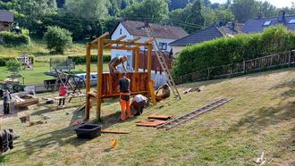 Im Juli folgte ein gemeinschaftlicher Arbeitseinsatz: Am Unterstand des Spielplatzes wurden beschädigte Bretter entfernt und durch neues Holz ersetzt. Auch das Häuschen an der Rutsche wurde komplett erneuert. In einem nächsten Schritt sollen das verbaute Holz mit einem Schutzanstrich versehen, die Rutschen frisch gestrichen und die Schaukelanlage erneuert werden.