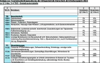 Die Anlage zur Tourismusbeitragssatzung – Betriebsartentabelle zu § 3 Abs. 3 und 4 TBS – der Ortsgemeinde Darscheid wird wie folgt neu gefasst: