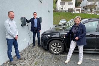 (v.l.): Gemeinsam nahmen Thomas Schömer (Technischer Mitarbeiter der Verbandsgemeinde Ruwer), Marco Felten (Westenergie) und Bürgermeisterin Stephanie Nickels die beiden neuen Elektro-Wallboxen zum Aufladen von E-Autos am Verwaltungsstandort der Verbandsgemeinde Ruwer symbolisch in Betrieb.
