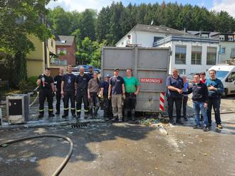 Ein kleiner Teil der Helfer bei einem mit Flutmüll beladenem Container der Fa. Remondis. Auch ein Dank an Thomas Zimmer (3. v.r.) von der Fa. Remondis für das uneigennützige Engagement.