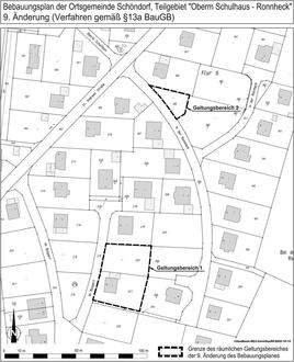 Der Gemeinderat Schöndorf hat in der Sitzung am 02.10.2024 gem. § 2 Abs. 1 i. V. m. § 13a BauGB beschlossen, den Bebauungsplan, Teilgebiet „Oberm Schulhaus – Ronnheck“ zu ändern. Im rechtsverbindlichen Bebauungsplan „Oberm Schulhaus-Ronnheck“ ist für das Grundstück Flur 6, Flurstück 188 die Nutzung als öffentliche Grünfläche/Parkplatz festgeschrieben. Zukünftig soll auf diesem Grundstück eine Bebauung mit Nebenanlagen zugelassen werden. Der Gebietscharakter wird in allgemeines Wohngebiet (WA) geändert.